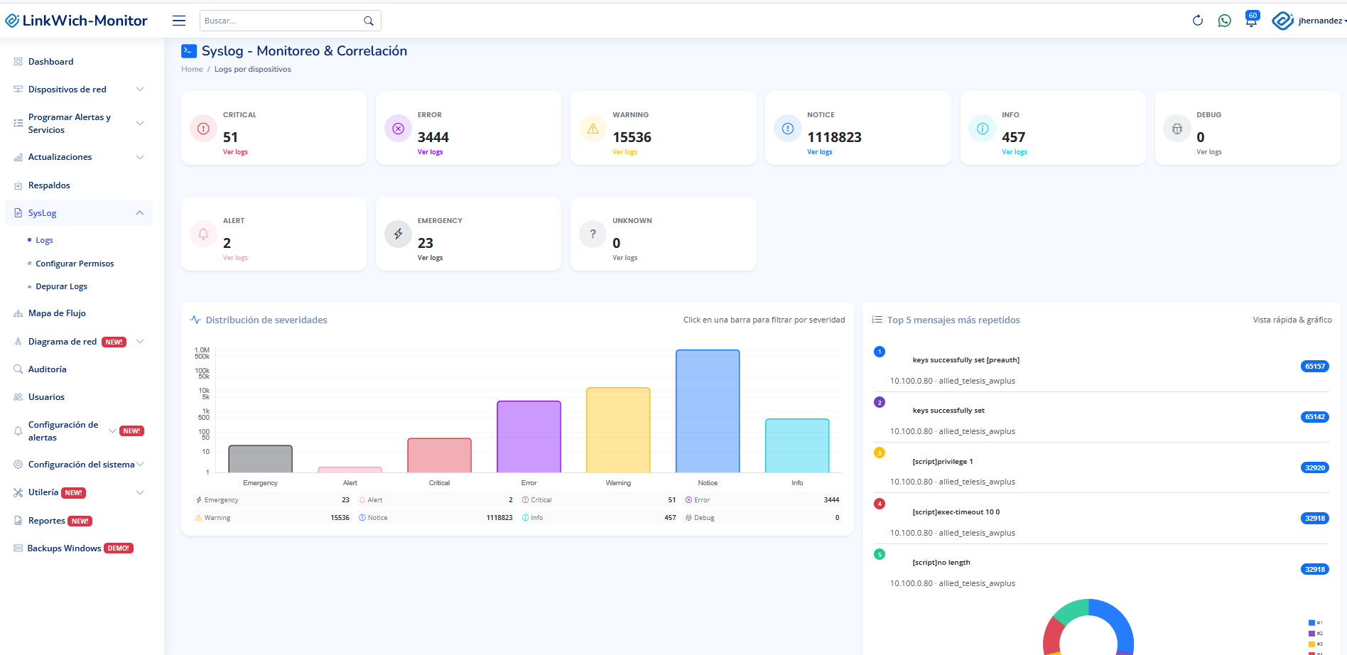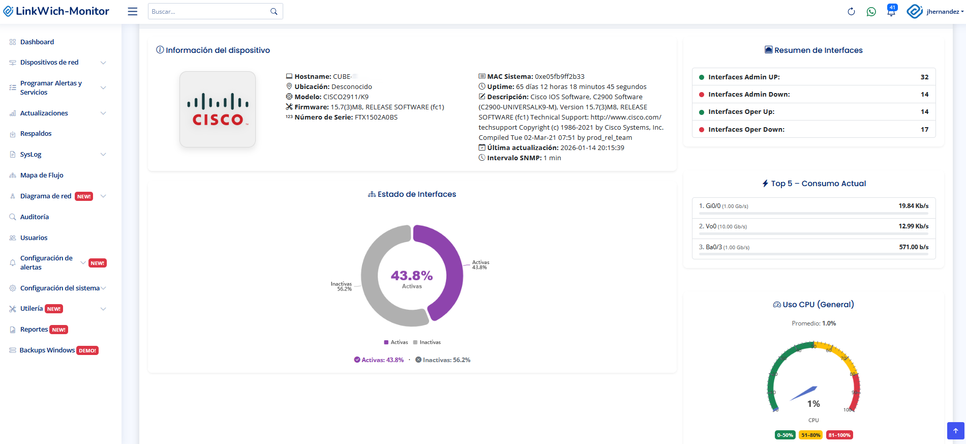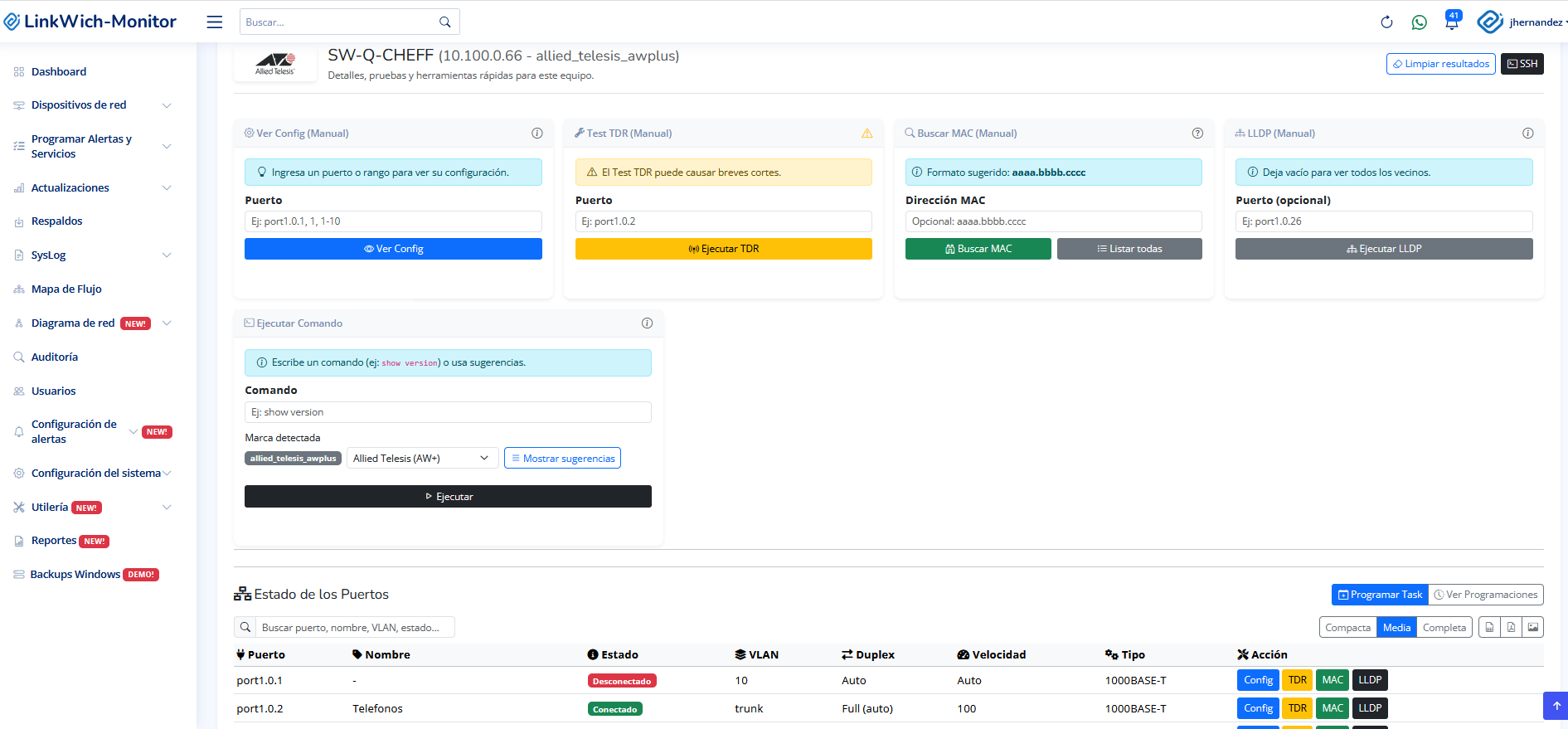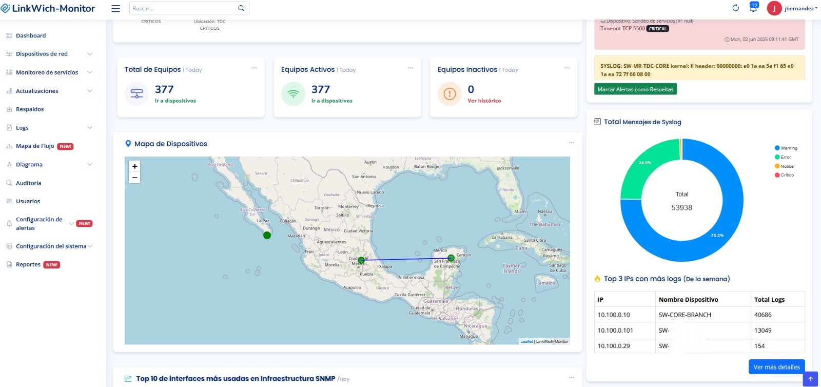 Monitoreo SNMP, syslog con IA, mapas LLDP, respaldos automáticos y mucho más en una sola plataforma.